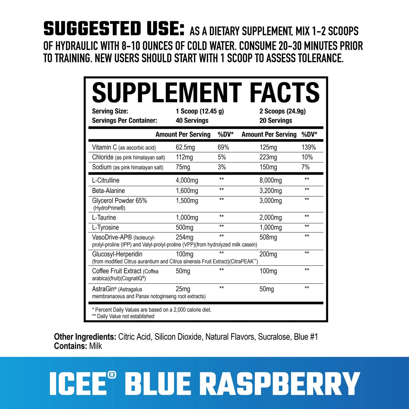HYDRAULIC V2 HAS HIGHER DOSES OF L-CITRULLINE AND BETA-ALANINE, IT ALSO FEATURES SEVERAL NEW TRADEMARKED INGREDIENTS INCLUDING VASODRIVE-AP®, CITRAPEAK®, HYDROPRIME®, COGNATIQ®, AND ASTRAGIN®.